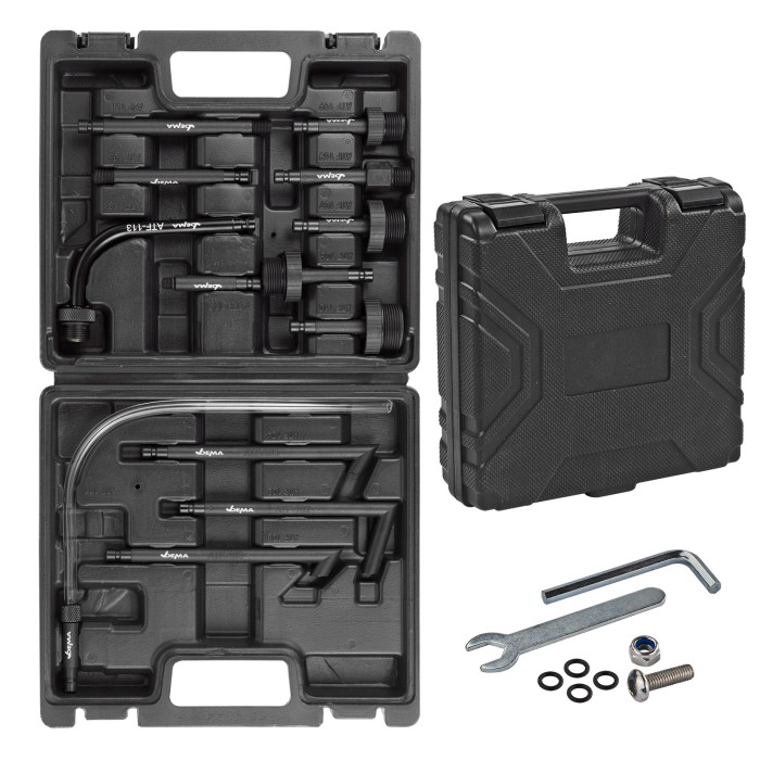 Différents adaptateurs garantissent un remplissage sécurisé pour la quasi-totalité des marques. Idéal pour les boîtes manuelles, automatiques et DSG. Que le remplissage se fasse par le haut ou par le bas via le tuyau de trop-plein, la vidange de votre boîte de vitesses n'a jamais été aussi simple.